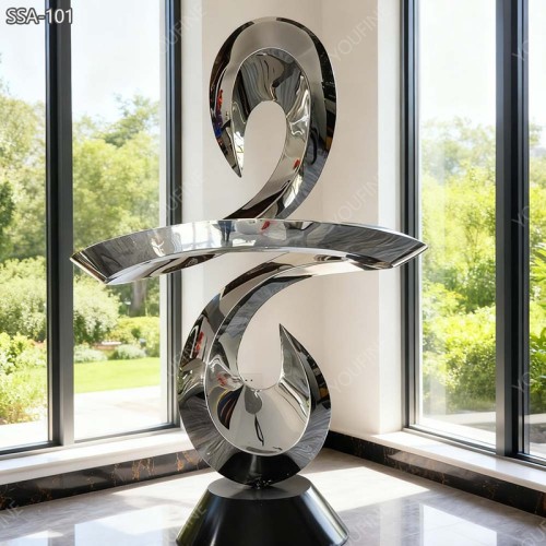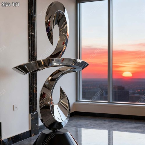 This stainless steel sculpture is a modern abstract artwork. It has a smooth mirror polish surface, and it shines beautifully under sunlight and indoor lighting. The sculpture has a flowing, curved design that looks simple and elegant. It creates a modern feeling in any space. It is a good choice for gardens, hotels, villas, offices, or commercial buildings.