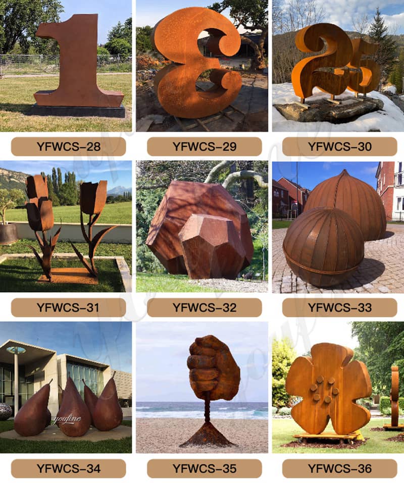 We have many designs for Acier Corten Sculpture like this. Whether it is a beautiful metal flower or an abstract Corten Sculpture, we have a wealth of designs for you to choose from. At the same time, we also have sculptures with various themes such as digital sculptures, fruit sculptures, desert sculptures, marine sculptures, etc. to satisfy your decoration of different places. So, you could find the most suitable sculpture design in our factory.