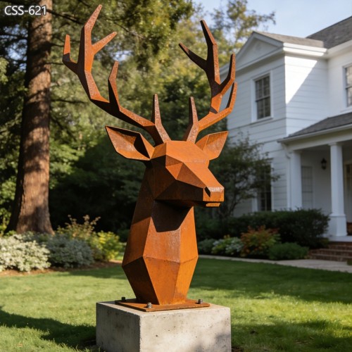 Because this Geometric Deer Head Sculpture is made of corten steel, it has many advantages given by corten steel. The first is that the colors are gorgeous and fascinating. Moreover, this metal deer has good weather resistance and is not afraid of the erosion of the natural environment. It could be kept outdoors for many years. Moreover, the surface of the metal deer head sculpture has a rough graininess, so the whole deer head sculpture looks very heavy and full of presence.