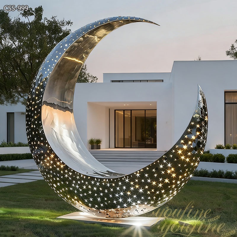Stainless steel is chosen as the raw material for this moon sculpture because stainless steel is corrosion-resistant and high-temperature-resistant. In this way, stainless steel sculptures are very suitable for long-term outdoor display. And the surface of stainless steel is very easy to clean. Therefore, stainless steel sculptures are easy to keep beautiful. So in many modern outdoor places, stainless steel abstract sculptures are a good choice for decoration.