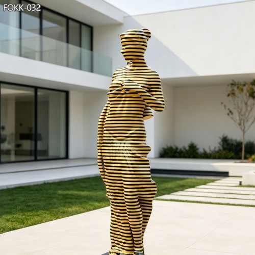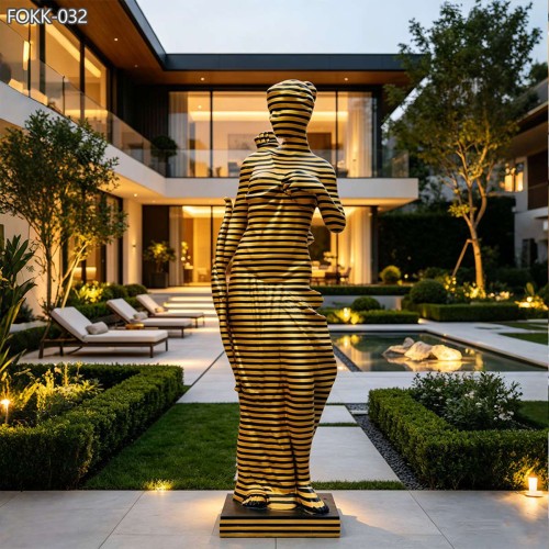 The most eye-catching part of this sculpture is the black and gold striped surface. These stripes create a strong visual rhythm. They make the sculpture look fashionable and artistic.
