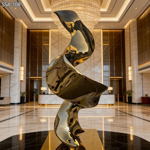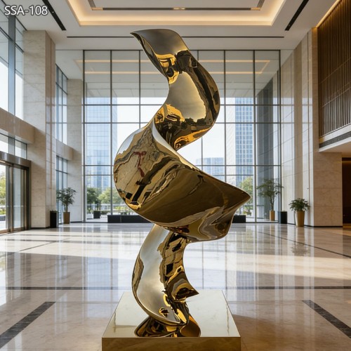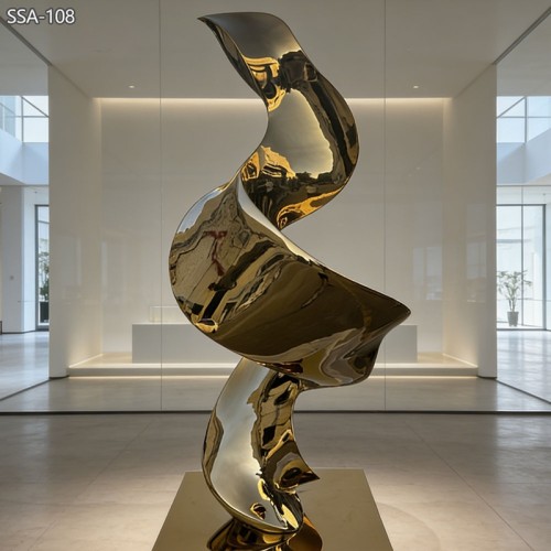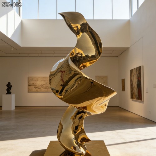 This sculpture features a rich gold color and a smooth flowing form. The design looks like a soft ribbon moving in space. The curves are elegant and balanced. The gold finish gives a strong feeling of luxury and prestige. It is perfect for places that want to show high quality and style.