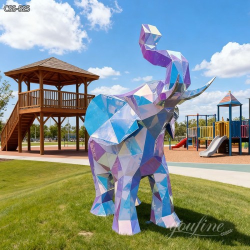 This metal elephant statue easily captures people’s eyes. The dreamy color composed of blue, purple, and pink is its biggest feature. Its design is novel, using geometric surfaces and dreamy colors to form a beautiful visual feast. It is a perfect collision of colors and sculptures. Such a sculpture would be a highlight no matter where it is placed and would attract more tourists and crowds for you.