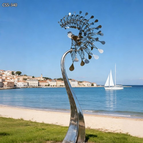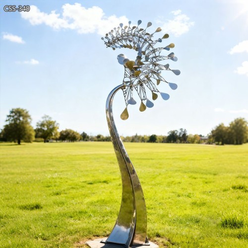 Metal kinetic outdoor sculpture is a very popular modern metal sculpture design series. Because of its combination with dynamics, it can bring people a different visual experience and effects. The branches of this large metal-kinetic sculpture are curved, and the rotating part at the top is like a garland. The sculpture will be very beautiful after rotating with the wind.