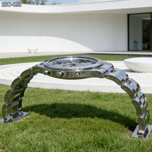 This sculpture is designed in the shape of a watch. It is not only a decorative sculpture but also a functional small table. The top surface is flat and stable, so it can hold drinks, books, or small decorative items.