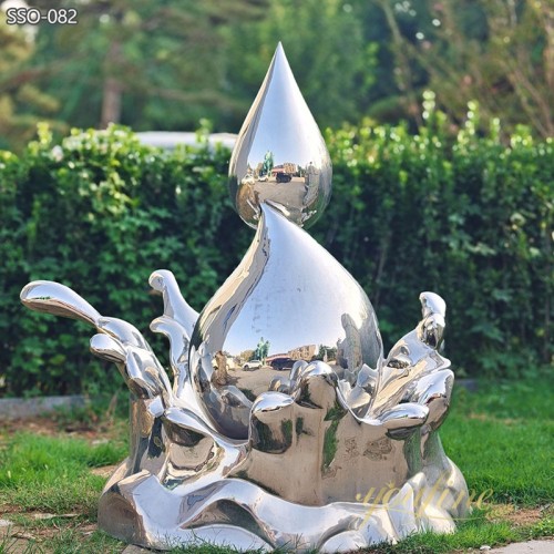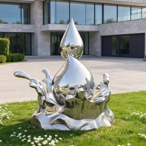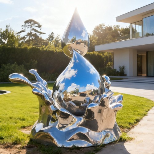This sculpture shows a giant water drop falling into waves. The smooth stainless steel surface shines like a mirror. It captures the exciting moment of a splash. The simple shape makes it a strong modern art piece.