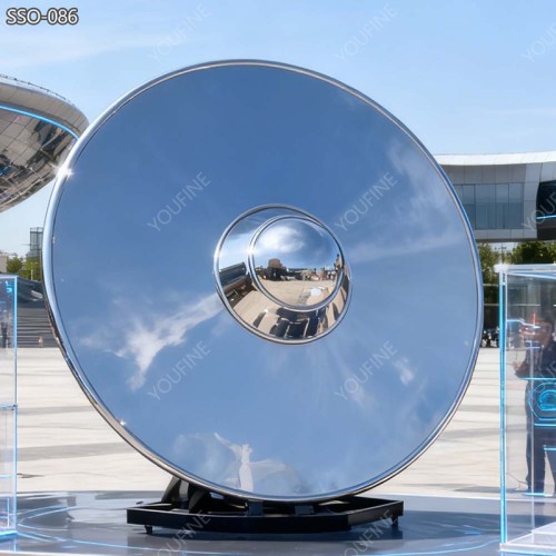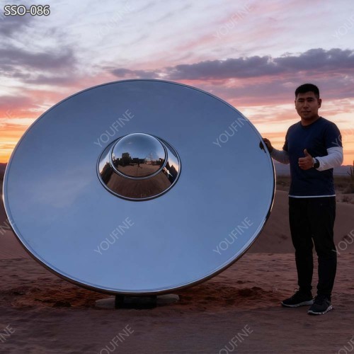 This stainless steel sculpture has a modern UFO-inspired design. The overall shape is a large disc with a raised circular structure in the center. Its abstract form gives it a futuristic appearance. The sculpture combines technology and art, making it a striking centerpiece for any space.