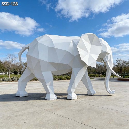This sculpture shows an elephant in a geometric style. The body is made of many flat polygon surfaces. This creates a modern and artistic look. The elephant shape is strong and powerful, but the geometric style makes it fresh and creative.